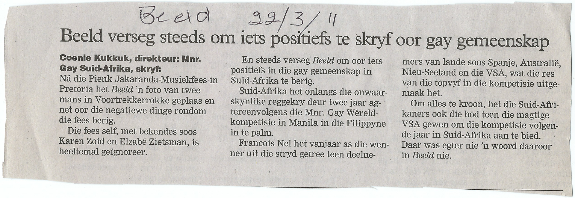 Beeld verseg steeds om iets positiefs te skryf oor gay gemeenskap Coenraad Kukkuk Attorneys22 March 201128 March 2017 Enlarge